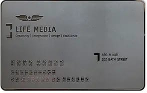 Möchten Sie eine Metallkarte mit einem besonderen Effekt gestalten? Wir unterstützen Sie gerne bei der Umsetzung Ihrer Ideen! Hinterlassen Sie den Eindruck, den Ihr Unternehmen verdient.